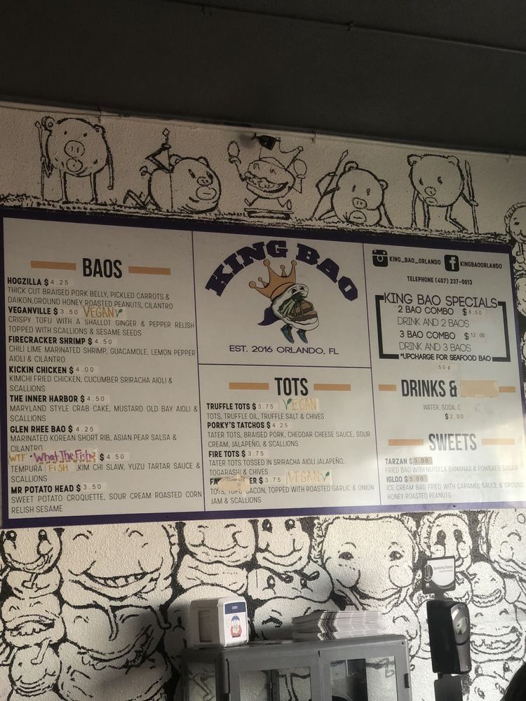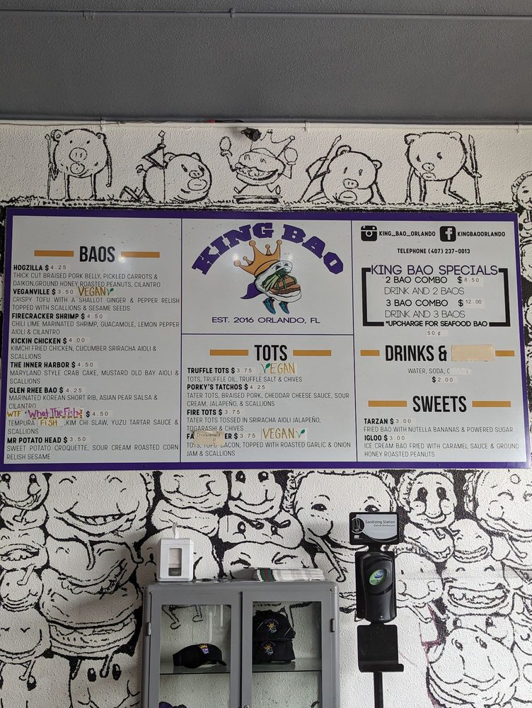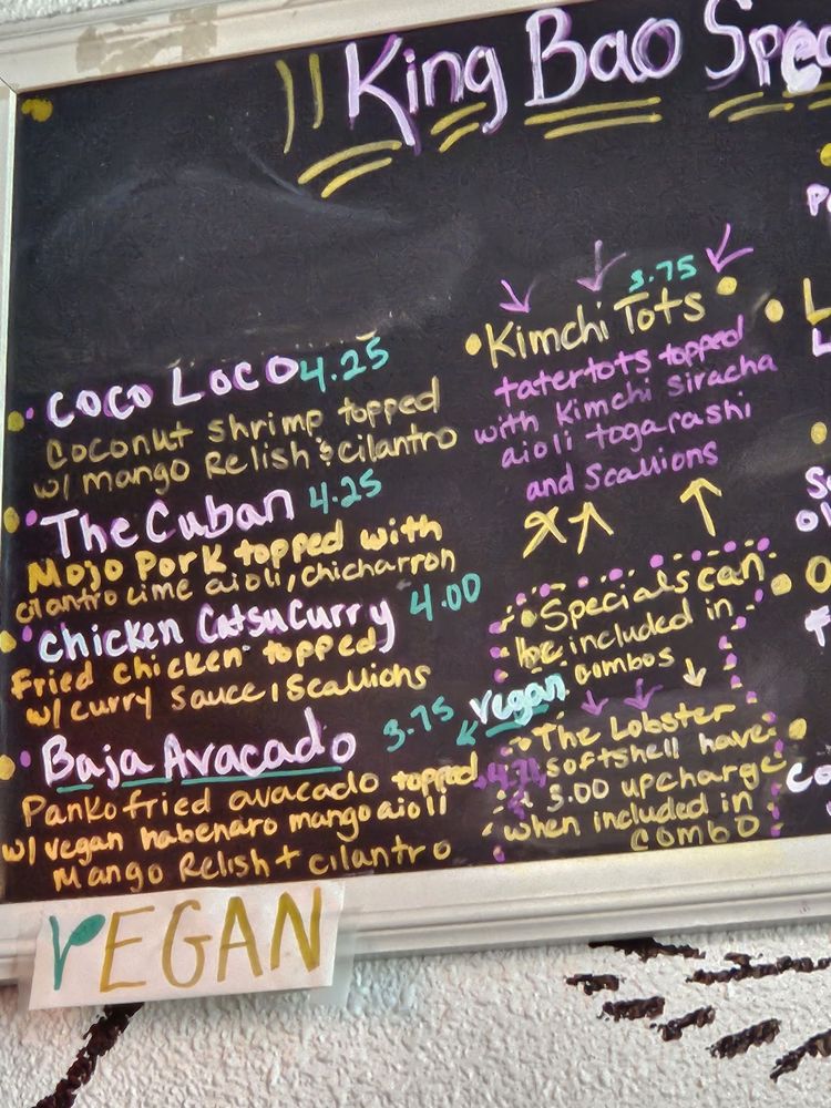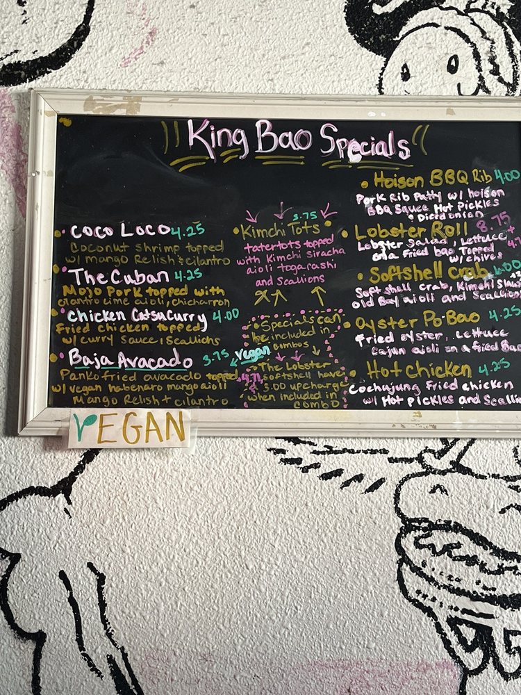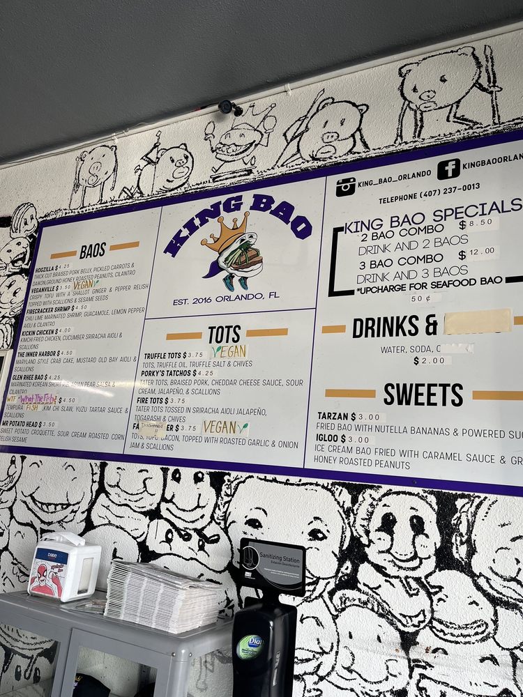 Introducing the vibrant and flavorful world of King Bao, located in Orlando, FL. This trendy restaurant offers a variety of bao buns, with options for vegans and meat lovers alike. Customers praise the quick service and unique combinations of flavors, making each bite a delightful experience. The establishment boasts a creative touch screen ordering system and a welcoming atmosphere with unique art pieces adorning the walls. Standout menu items include the Hogzilla, What the Fish, and Ouster Bao, which are expertly crafted to tantalize your taste buds. Whether you're looking for a quick snack or a full meal, King Bao impresses with its top-notch quality and friendly staff. Experience the fusion of traditional and innovative flavors at King Bao, where every bite is an adventure.