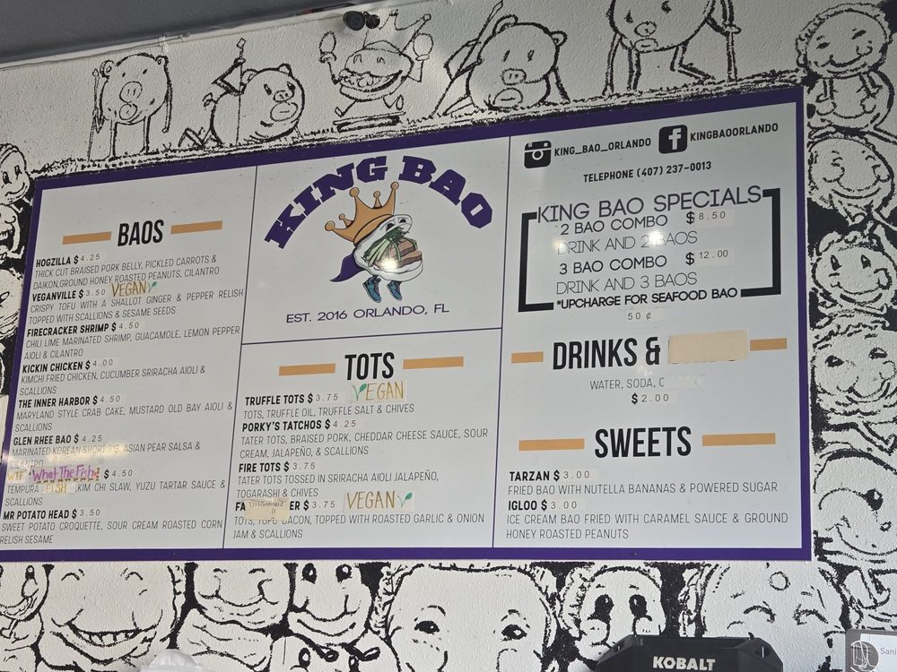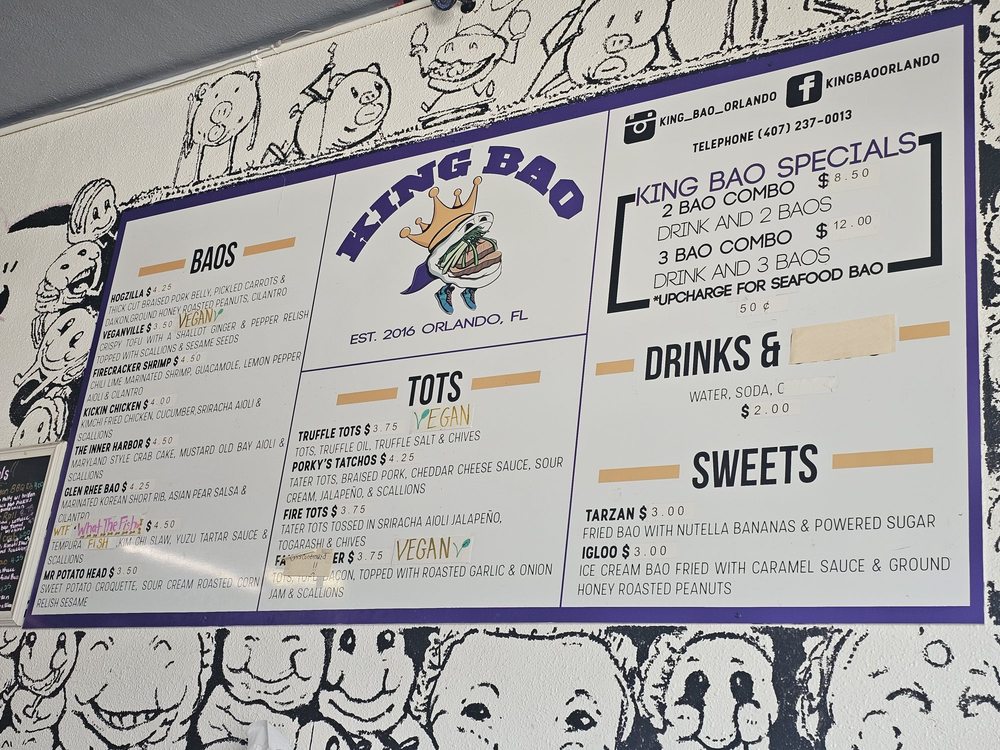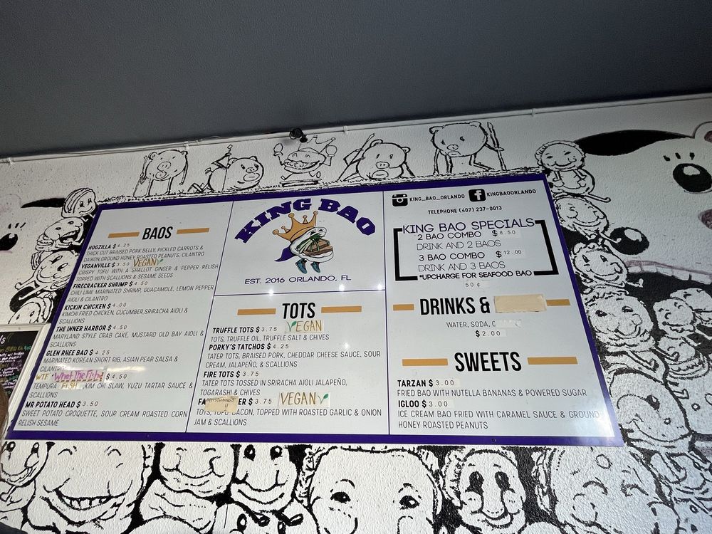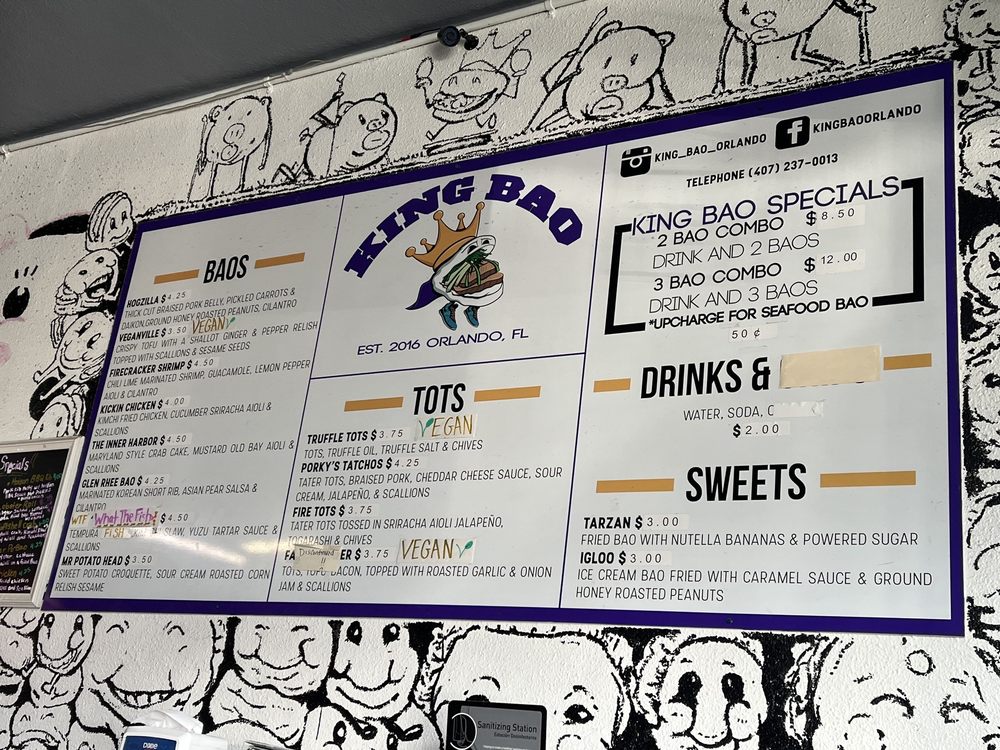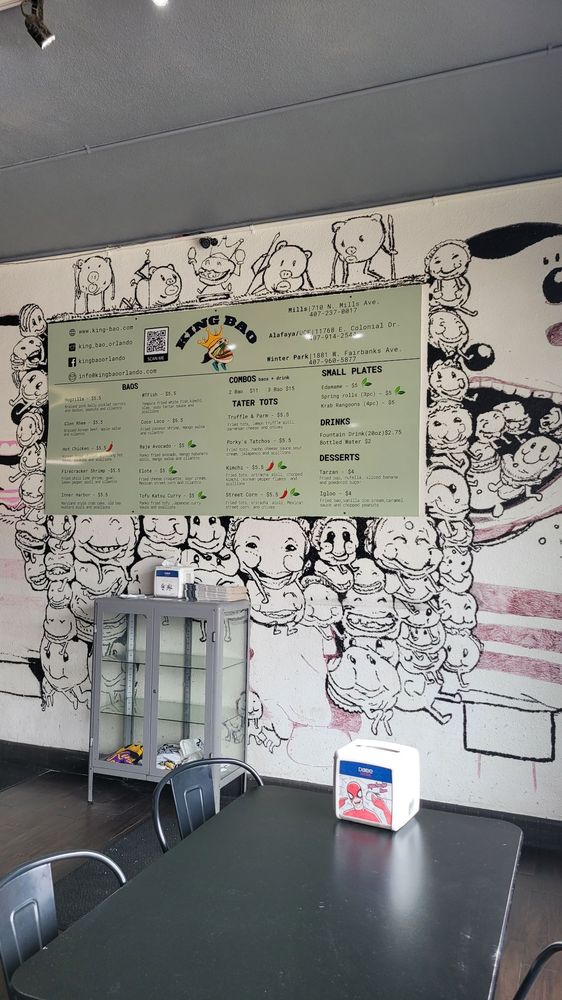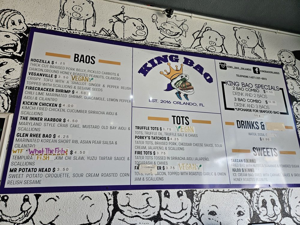 Introducing the vibrant and flavorful world of King Bao, located in Orlando, FL. This trendy restaurant offers a variety of bao buns, with options for vegans and meat lovers alike. Customers praise the quick service and unique combinations of flavors, making each bite a delightful experience. The establishment boasts a creative touch screen ordering system and a welcoming atmosphere with unique art pieces adorning the walls. Standout menu items include the Hogzilla, What the Fish, and Ouster Bao, which are expertly crafted to tantalize your taste buds. Whether you're looking for a quick snack or a full meal, King Bao impresses with its top-notch quality and friendly staff. Experience the fusion of traditional and innovative flavors at King Bao, where every bite is an adventure.